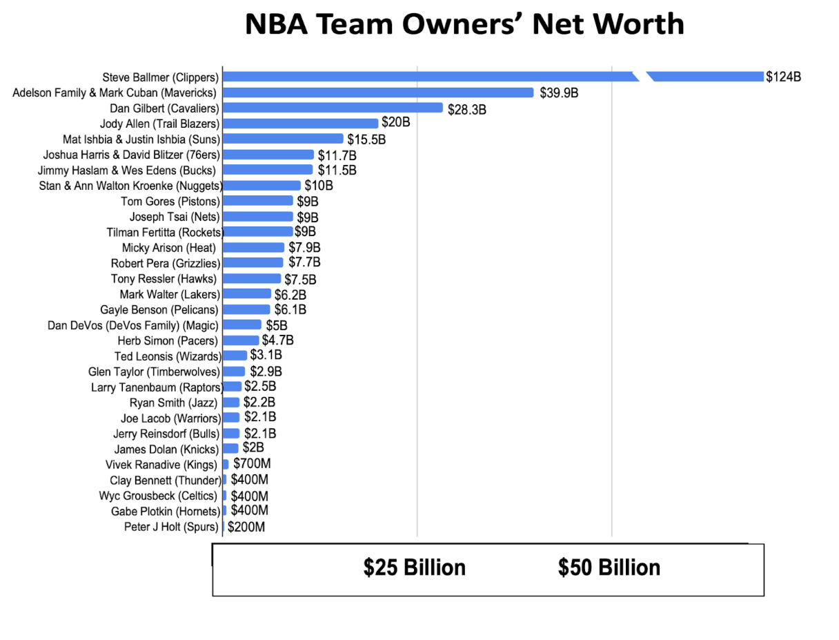 Twenty-five of the NBA’s 30 teams are owned by an identified billionaire, billionaire family or billionaire partnership. The median ownership net worth among the 29 American-owned teams is over $12 billion. That’s 60,000 times more than the median U.S. household wealth in 2022 (the latest year with available data) of $192,700.